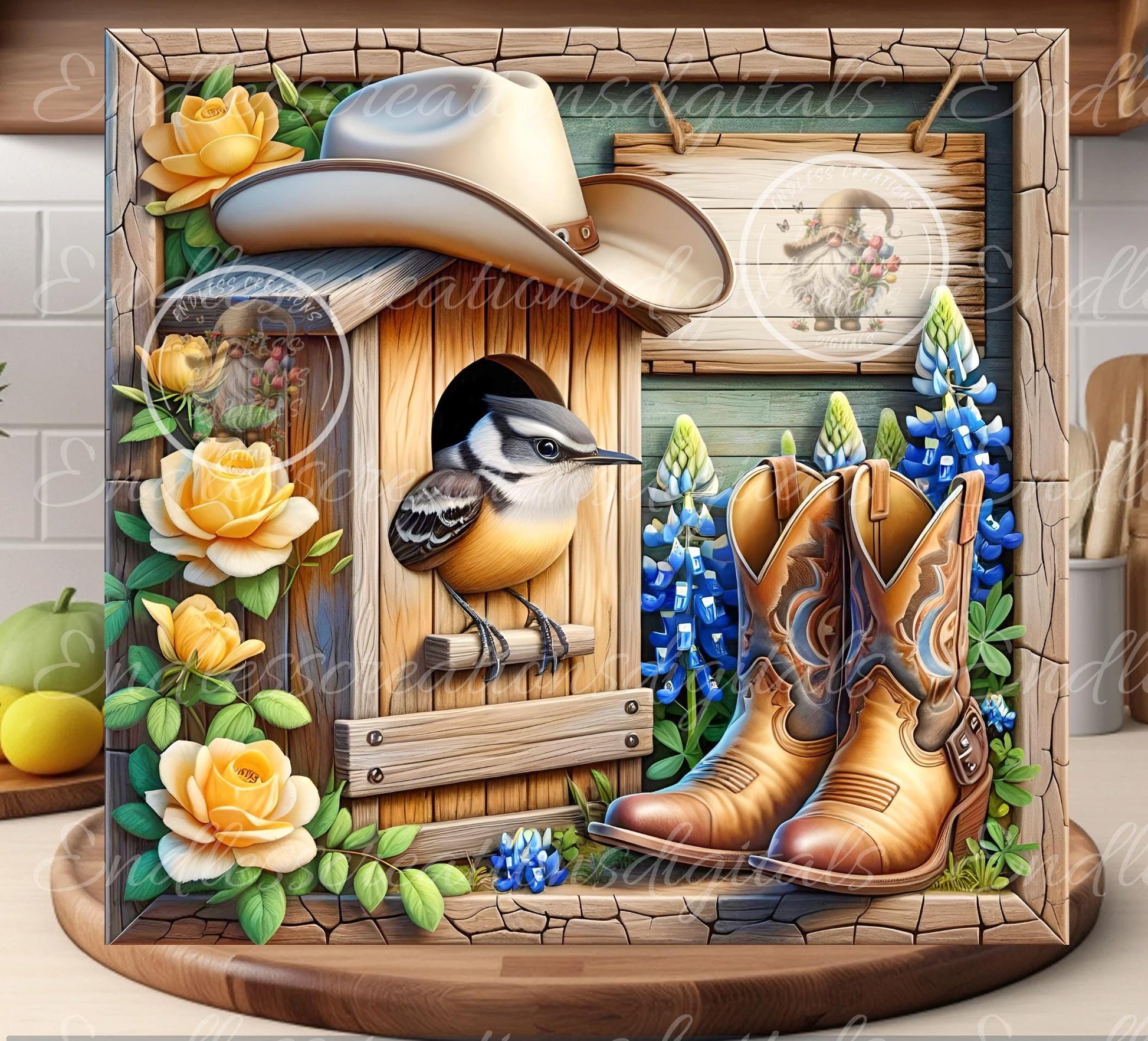 KICK OFF YOUR BOOTS AND STAY AWHILE, Rustic round framed image encasing beautiful GROWING BLUEBONNETS AND YELLOW ROSES ACCOMPANIED BY A PAIR OF COWBOY BOOTS, BIRDHOUSE, MOCKINGBIRD! Perfect for use in your next wreath or sublimation project!