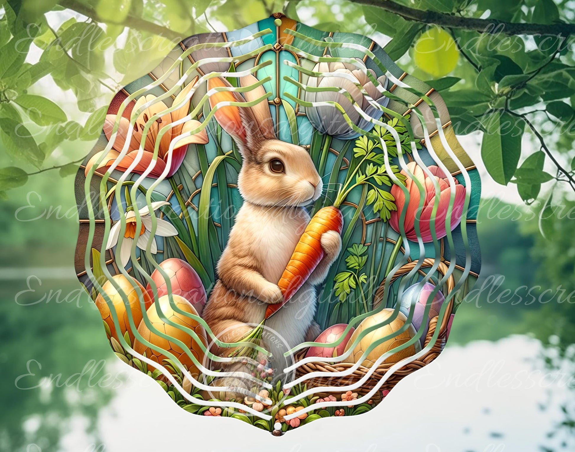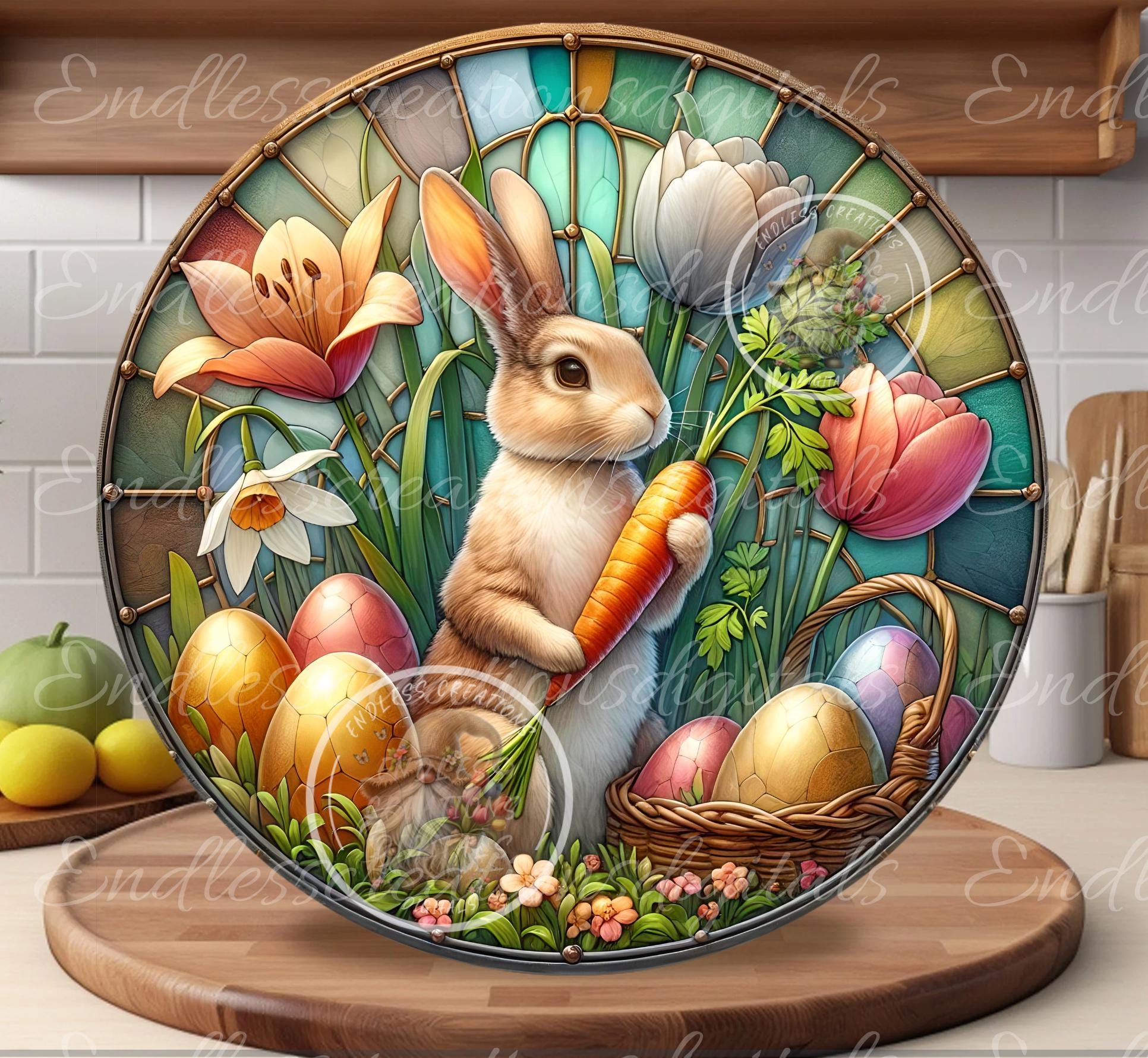 Beautiful STAINED GLASS EFFECT Easter Rabbit amongst some painted easter eggs and TULIPS! Will be perfect for any of your round Sublimation blanks like WREATH SIGNS, DOOR HANGERS, GLASS CUTTING BOARDS, WIND SPINNERS, ROUND SLATES ETC. IMAGES ARE AI ASSISTED WITH MY CREATIVE PROMPTS AND PUT THROUGH SEVERAL EXTENSIVE EDITING PROGRAMS TO GIVE YOU THE BEST QUALITY IMAGES FOR YOUR NEXT SUBLIMATION PROJECT!!