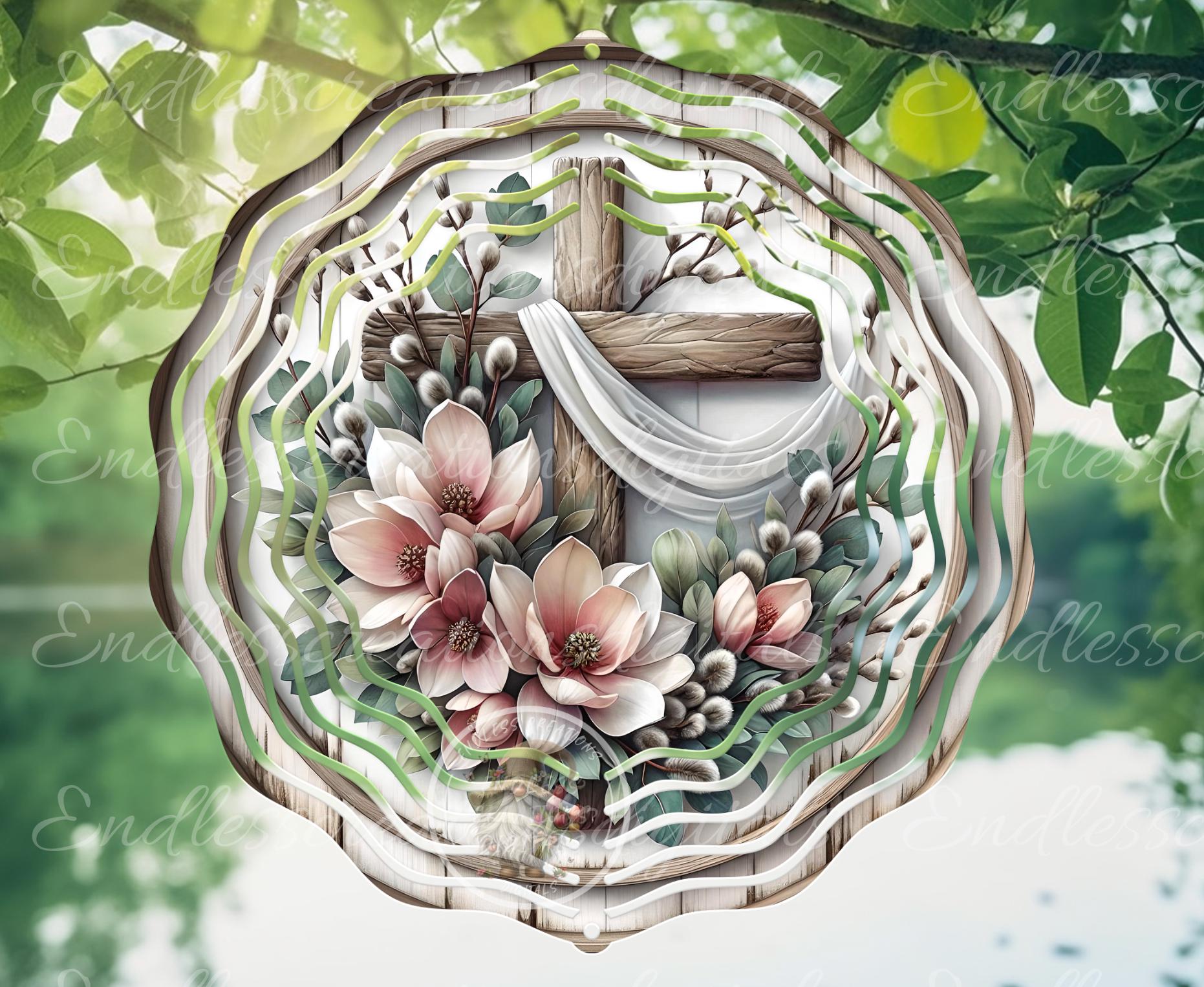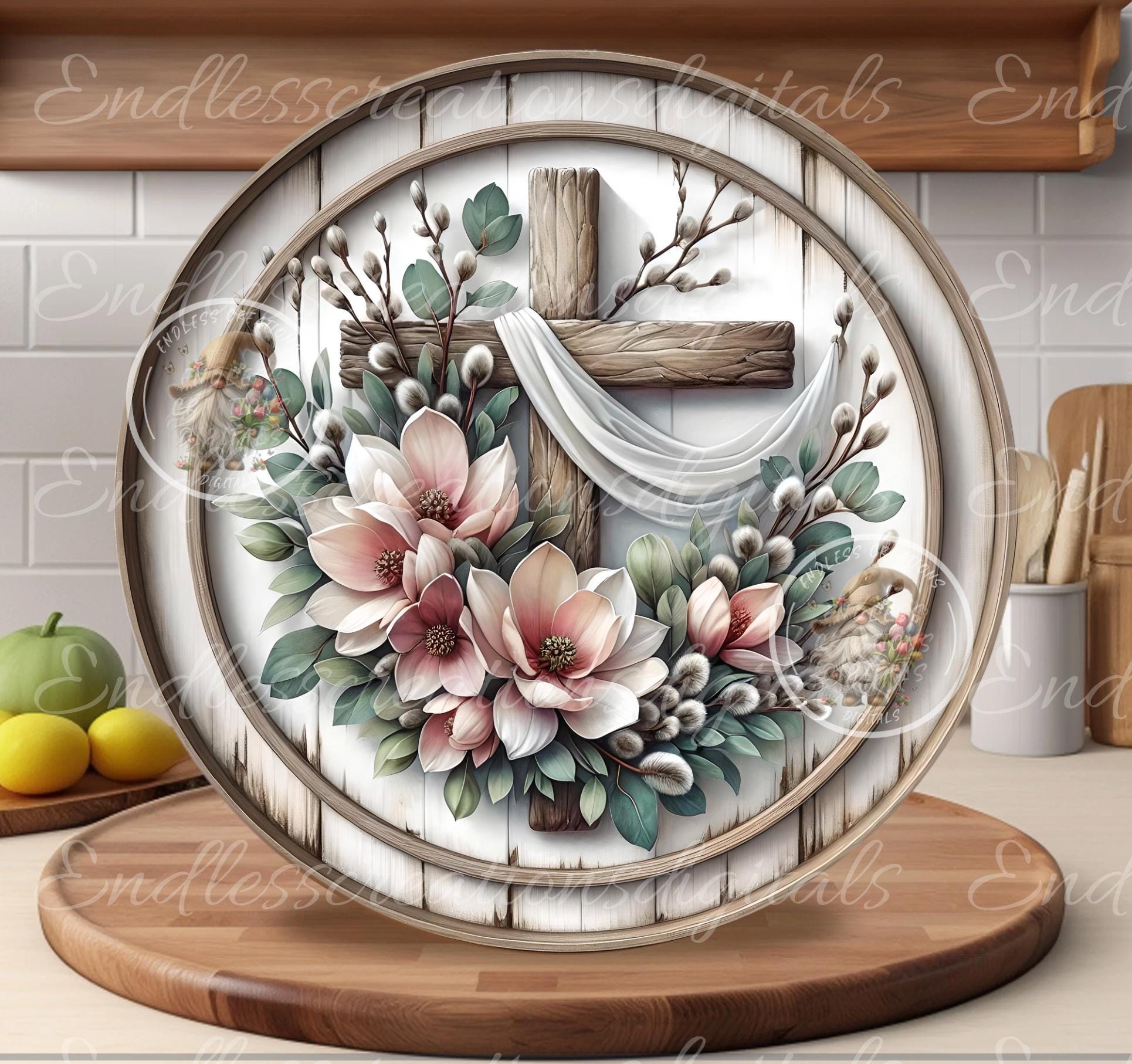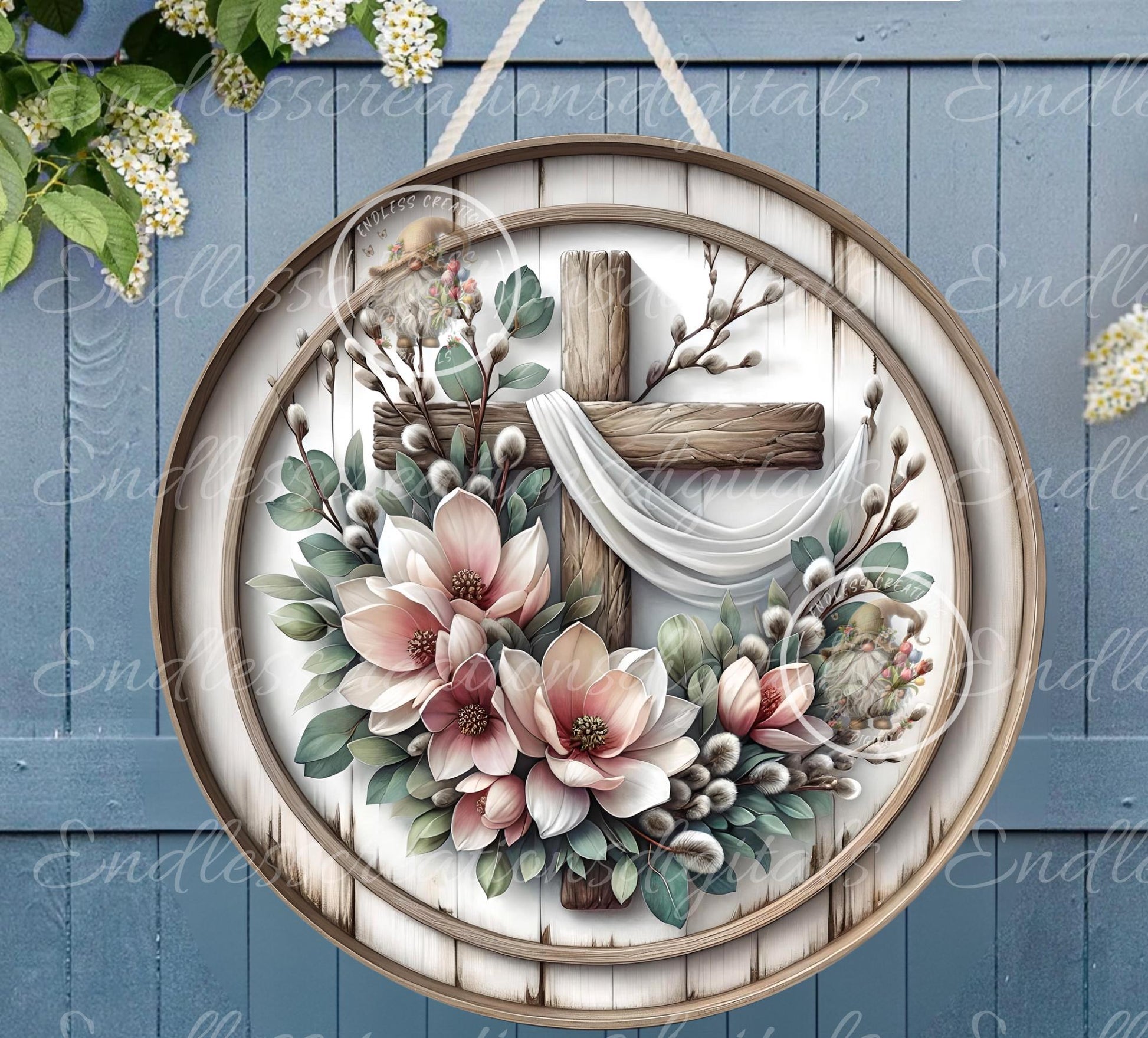 MAGNIFICANT MAGNOLIA FLORAL EASTER CROSS, Rustic round framed image encasing beautiful GROWING MAGNOLIAS ACCOMPANIED BY WOOD CROSS AND FLOWING SILK SCARF! Perfect for use in your next wreath or sublimation project!