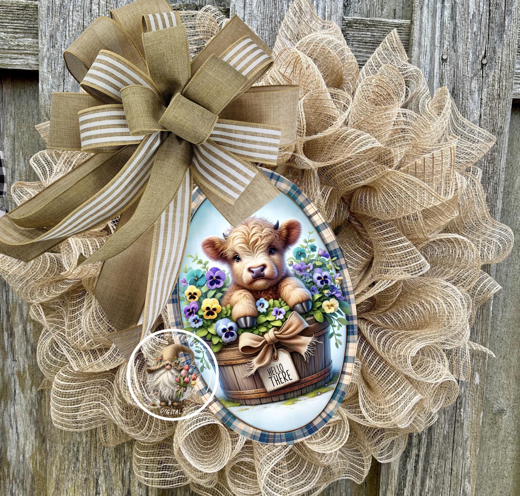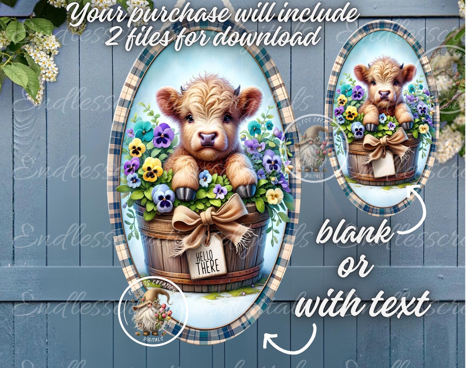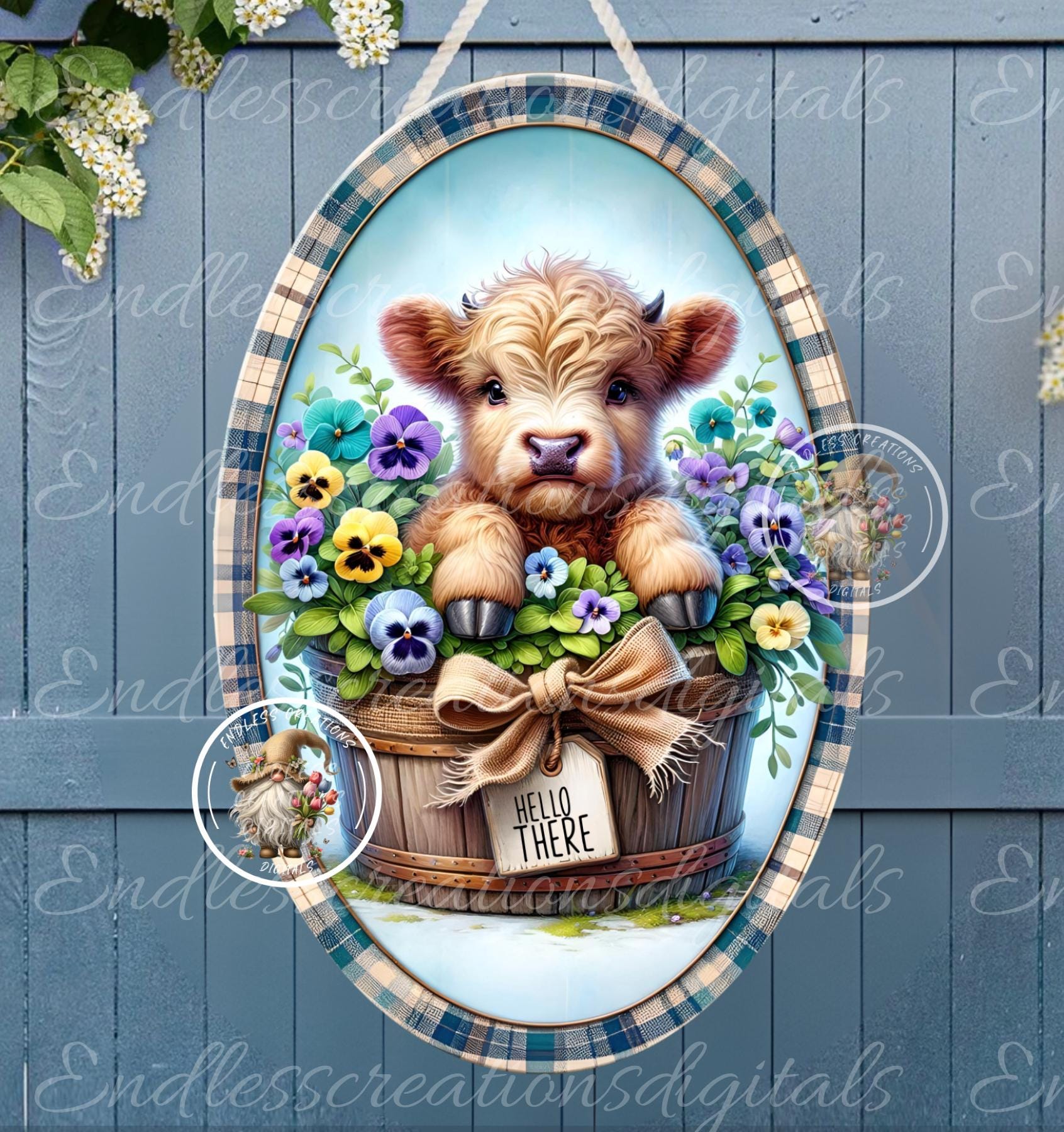 BEAUTIFUL 7 x 12 OVAL 3D IMAGE "HELLO THERE" BABY HIGHLAND IN A BARREL OF PANSIES IMAGE THAT WILL LOOK ABSOLUTELY STUNNING ON YOUR NEXT SUBLIMATION PROJECT OF A DOOR HANGER OR WREATH SIGNS. IMAGE IS OF EXCELLENT HIGH QUALITY 300 DPI!! COMES WITH 2 FILES FOR DOWNLOAD INCLUDING 1 BLANK TO ADD YOUR OWN TEXT