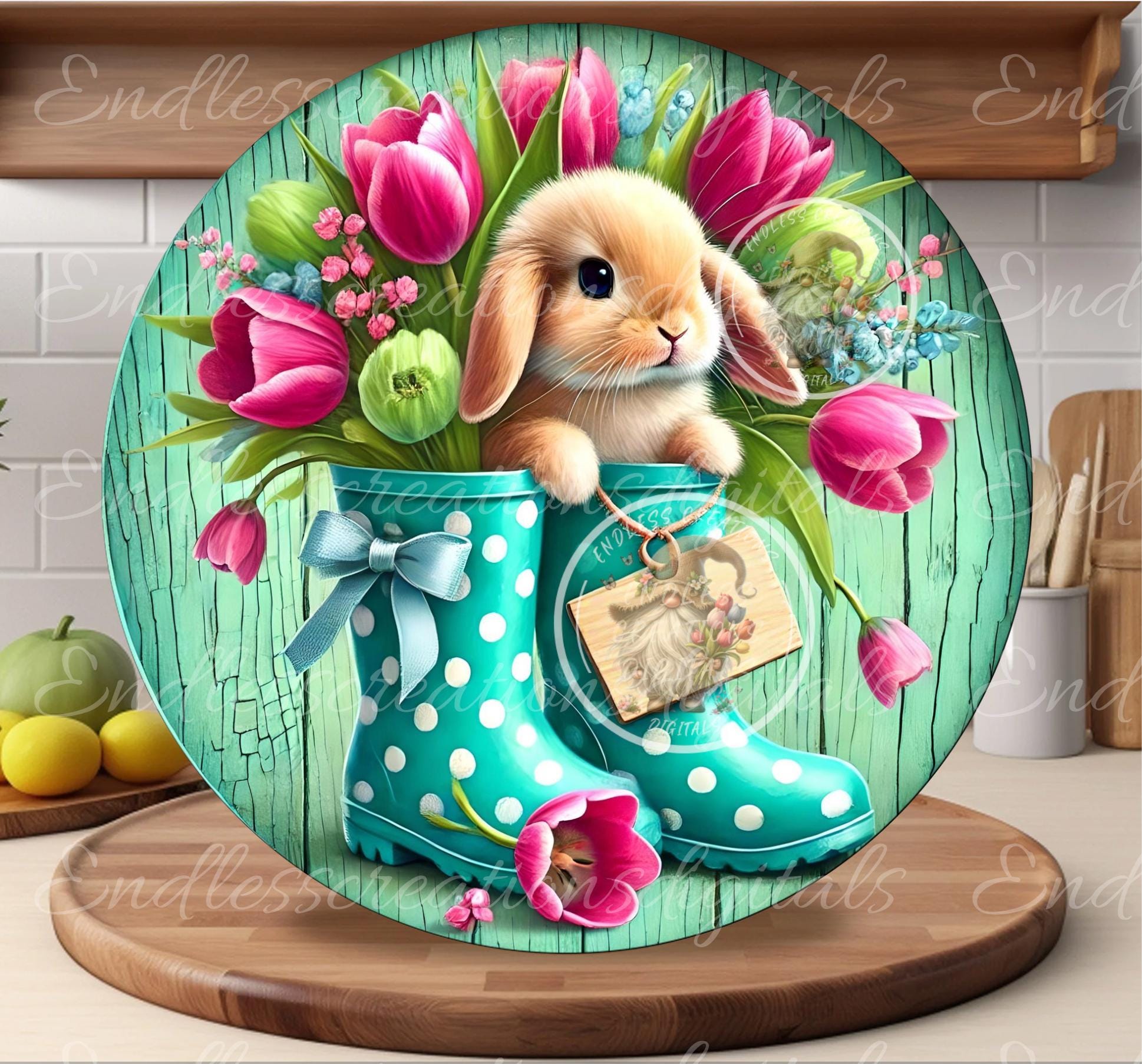 HAPPY EASTER FLORAL BUNNY IN WREATH. ROUND image encasing A PAIR OF CUTE RAIN BOOTS, BEAUTIFUL TULIPS ACCOMPANIED BY A CUTE BABY BUNNY! Perfect for use in your next wreath or sublimation project! COMES WITH 2 FILES, 1 BEING A BLANK THAT YOU CAN CUSTOMIZE WITH YOUR OWN TEXT