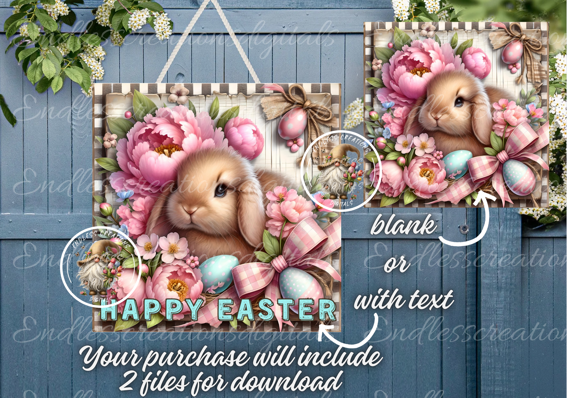 BEAUTIFUL SQUARE HAPPY EASTER BUNNY AMONGST LUSH PEONIES. COMES WITH 2 FILES, 1 BLANK TO ADD YOUR TEXT FOR PERSONALIZATION! Perfect for use in your next wreath or sublimation project!