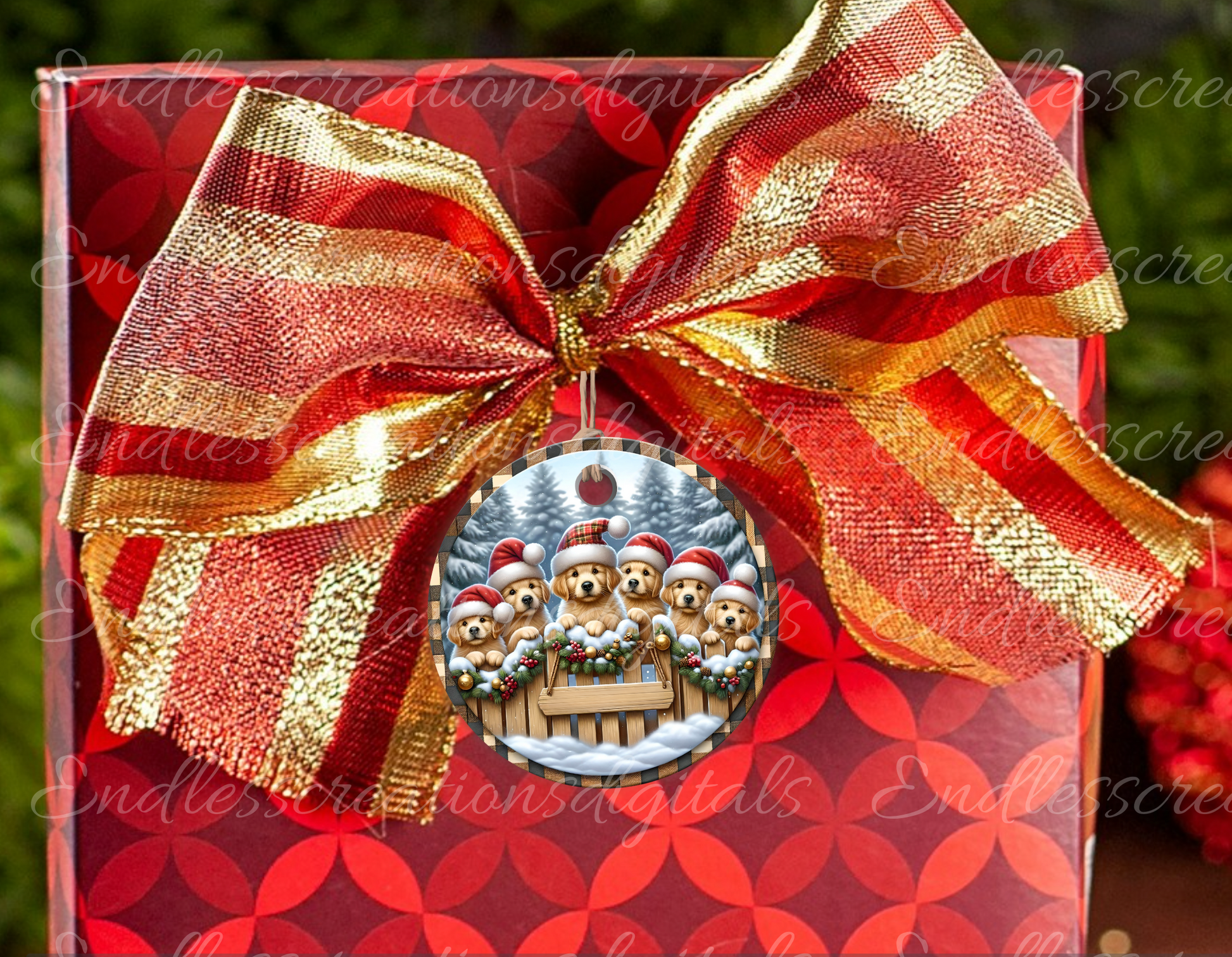 CUTE GOLDEN RETRIEVER PUPS WAITING FOR SANTA DESIGN WILL LOOK STUNNING ON YOUR NEXT SUBLIMATION PROJECT. USE ON GLASS CUTTING BOARDS, ROUND DOOR HANGERS, WREATH SIGNS, ORNAMENTS, GIFT TAGS. IMAGES ARE OF EXCELLENT HIGH QUALITY 300 DPI COMES WITH 2 AMAZING DOWNLOADS INCLUDING 1 BLANK